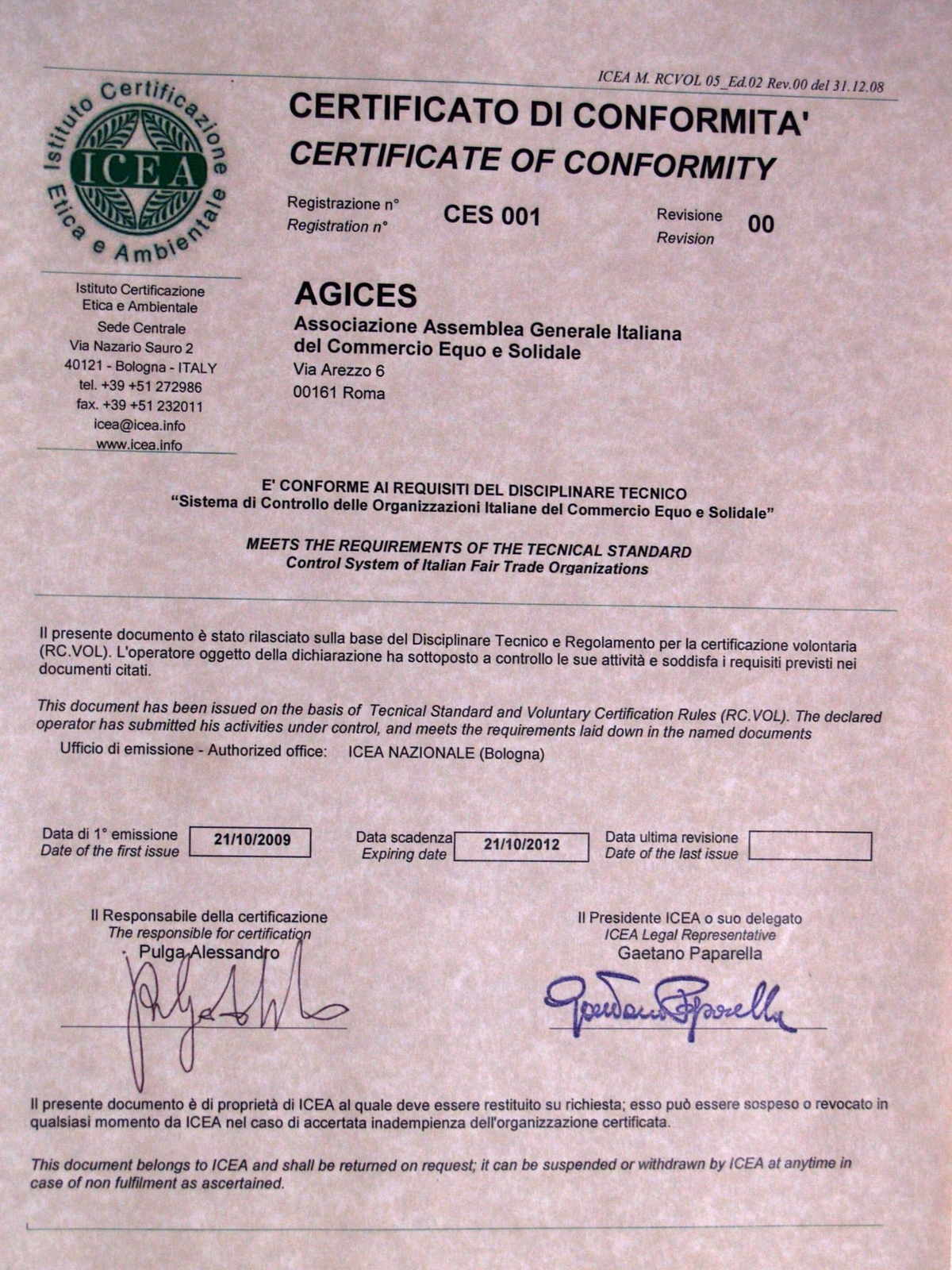 REGISTRO AGICES e sistema di controllo Il sistema AGICES prevede un meccanismo a tre livelli: autovalutazione, verifica interna e verifica esterna delle organizzazioni equosolidali. Con l'autovalutazione l’organizzazione italiana che vuole iscriversi al Registro AGICES compila un modulo dove dichiara di rispettare i requisiti della Carta e dei Regolamenti attuativi, fornendo tutti i documenti e le informazioni richieste a supporto. La verifica interna è gestita da un apposito organo dell'Associazione - il Comitato di Gestione del Registro AGICES – che controlla la corretta compilazione del modulo e la congruenza con la documentazione. Ogni anno il Comitato procede a verifiche a campione “sul campo”, per monitorare la veridicità e la correttezza dei dati. In caso di violazioni, si procede con sanzioni progressive fino all’espulsione.             Per dotarsi di un sistema di controllo che sia garantito anche da una verifica esterna, AGICES ha richiesto e ottenuto la certificazione di ICEA (Istituto per la Certificazione Etica e Ambientale) come ente terzo preposto a certificare il funzionamento delle procedure di monitoraggio AGICES sui propri associati. www.icea.info Infine, SAW (Social Accountability Watch) è una piattaforma web nella quale imprese profit e non profit inseriscono volontariamente il proprio profilo e accettano di ricevere osservazioni sui propri approcci, comportamenti, risultati da parte delle diverse parti interessate, sia attraverso il canale sistematico dei "monitori", sia che provengano dal pubblico generico. Tutte le organizzazioni iscritte al Registro AGICES accettano di partecipare al progetto SAW come apertura volontaria alla trasparenza.     www.sawnet.info Se hai domande specifiche o vuoi approfondire il tema, puoi scrivere a: registro@agices.org Se la tua organizzazione è interessata a diventare socia di AGICES, clicca qui per informazioni |